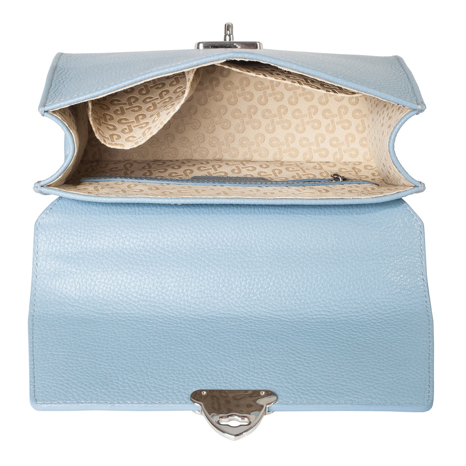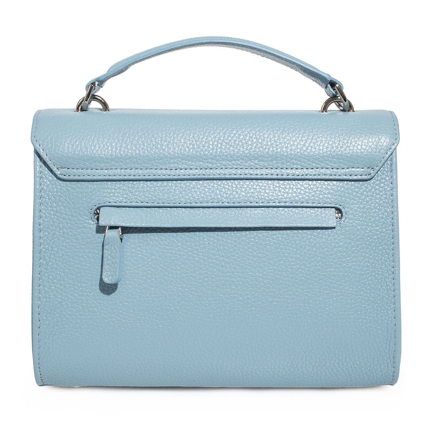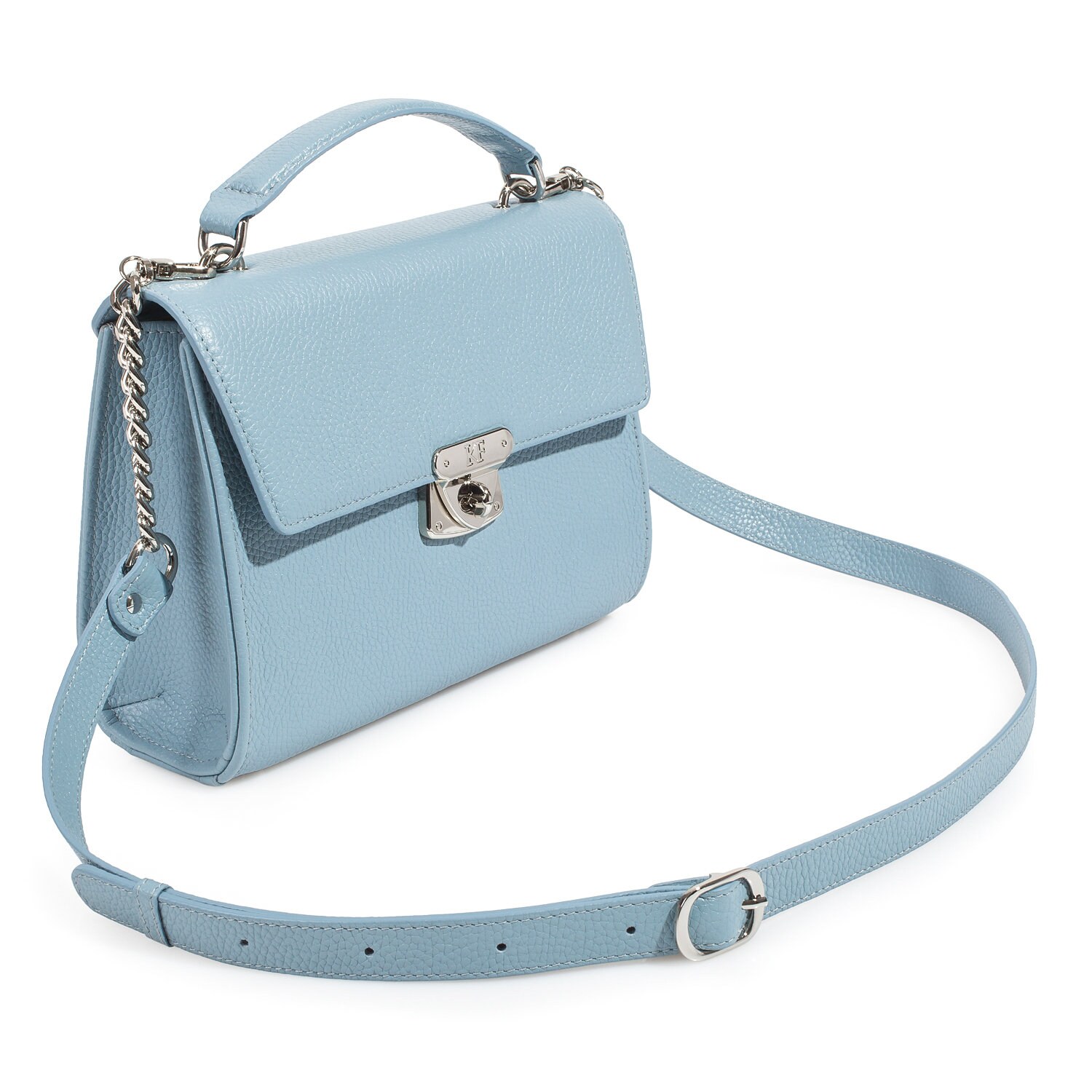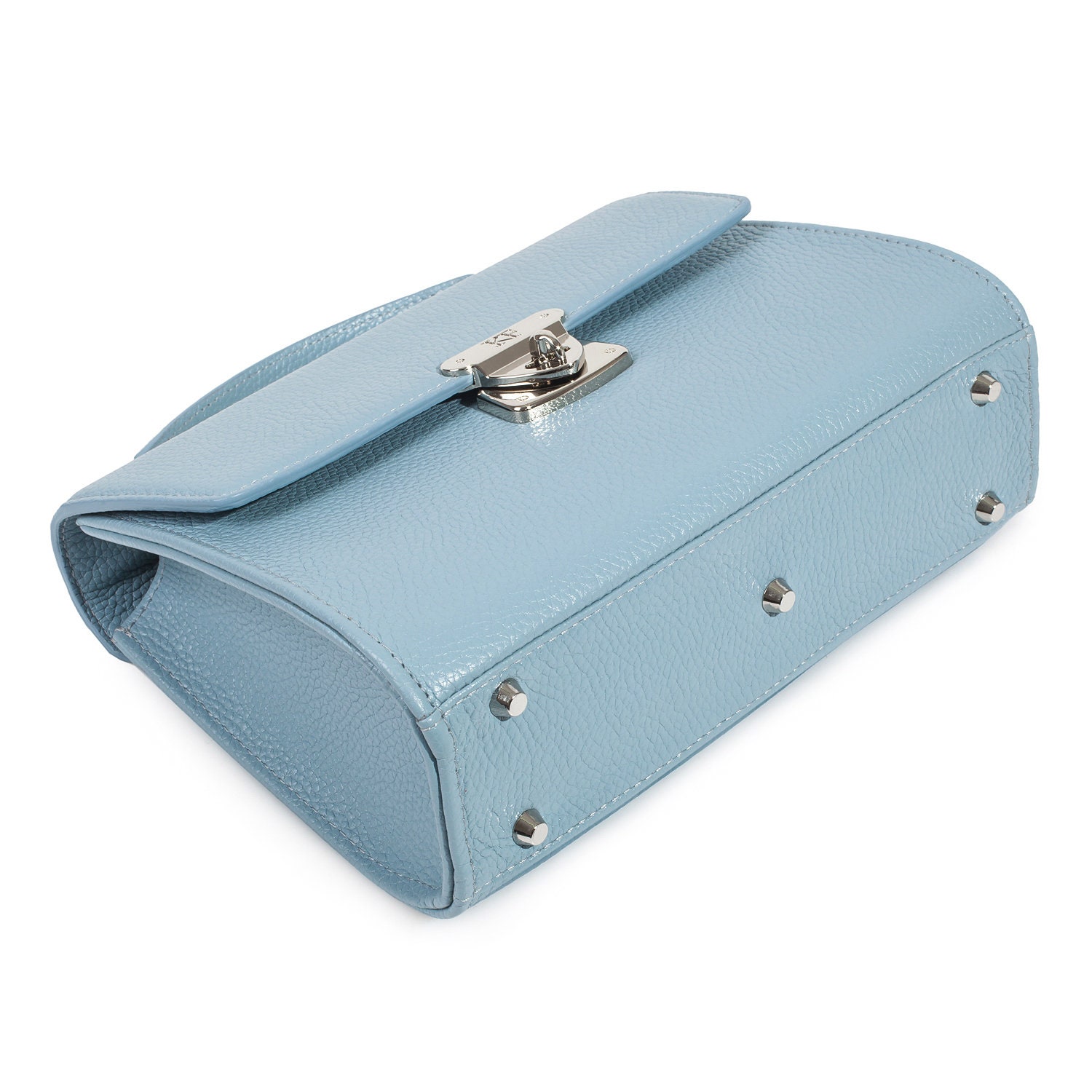 Blue genuine leather handbag from ukrainian designer Katerina Fox. The internal space of a bag is equipped with three spacious compartments and two patch-pockets and one zipper pocket. One of the spacious compartments is closed with a zipper. The bag is closed with a clasp. The bottom of the bag is protected with metal legs. There is a long handle that allows you to wear the bag on the shoulder. The kit also includes a storage bag.
